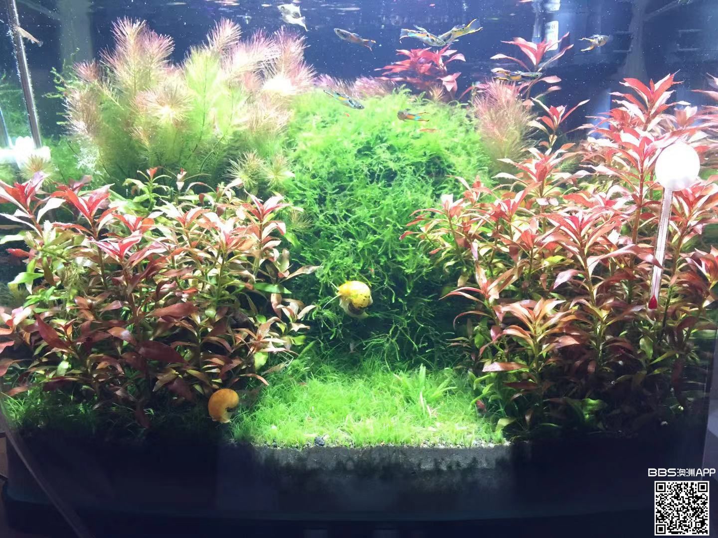 如题 出售50升已养好的草缸里面有7种水草,一种Java moss, 9条鱼(endler guppy),1条清道夫,7个Apple snail, 非常多的cherry shrimp 还有很多已经抱籽 (红, 粉, 白,黑),还有一些 Pes ...