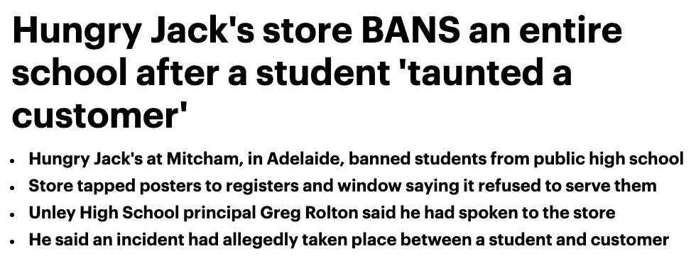 阿德莱德一家Hungry Jack’s将整个学校的高中生拉入黑名单! 表示这不是他们做生意的方式。 据报道,当天下午晚些时候, Mitcham店经理把两个牌子都拿掉了,禁令也被解除。