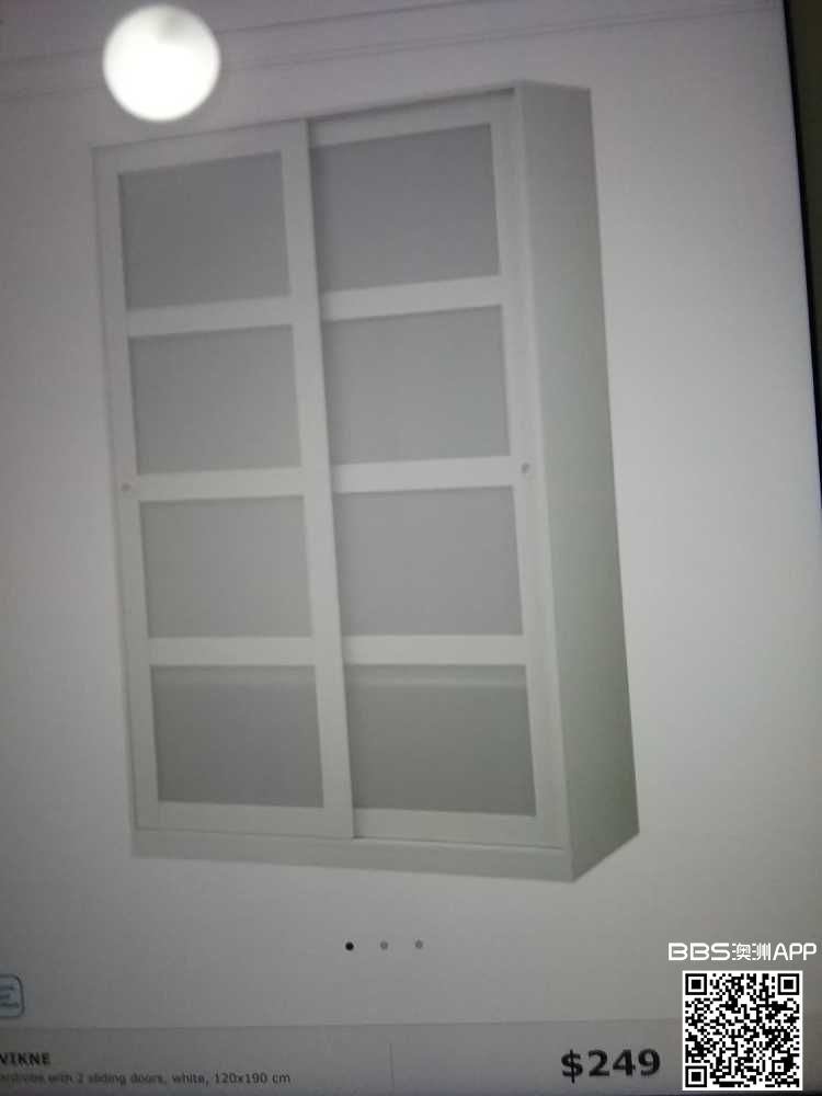 因搬家出售宜家KVIKNE衣柜,有2sliding doors,白色,120×190cm, $120,不需拆卸,两人用坚固的绳子可以扛起来。联系电话:0432234411