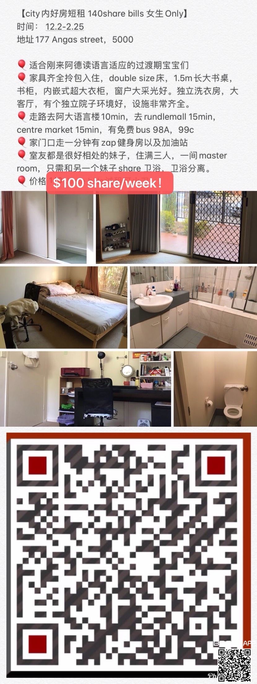 跳楼价100sharebills city内超大单间 地址177 angas street