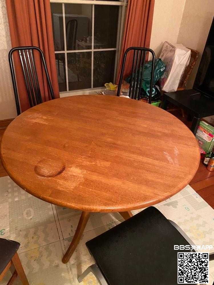 因搬家,现有实木圆桌,桌面有烫痕,价格60刀。金属椅子2把,木椅子3把,共计20刀。另有微波炉一台,20刀。burnside自提。有需要的短信联系0424784828