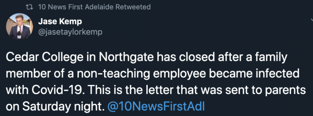 位于南澳Northgate的Cedar College将于今天起关闭两周,此前,该校一名未上班的职工的家属被确诊感染新冠病毒。