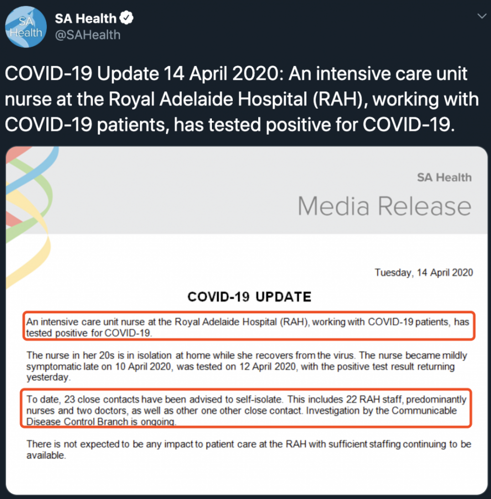 据SA Health确认,皇家阿德莱德医院重症监护室一名护士确诊,这名护士之前护理COVID-19患者。 确诊的护士为二十代女性,目前在家隔离。 4月10日晚些时候,该护士出现轻微症状,4月12号接受了病毒检测,4月13日 ...