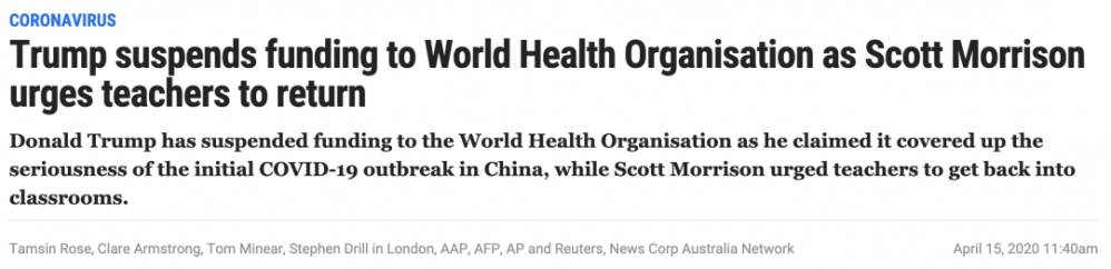 美国总统Donald Trump已暂停对世界卫生组织的资助,原因是他声称世卫组织在病毒首次在中国出现时未能采取足够措施阻止病毒传播。 联邦政府已经敦促学校继续对需要去工作的家长的孩子开放,同时也对弱势儿童开放 ...