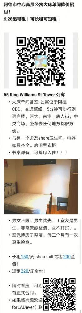阿德市中心高层公寓大床单间低价招租6.28起租!!
