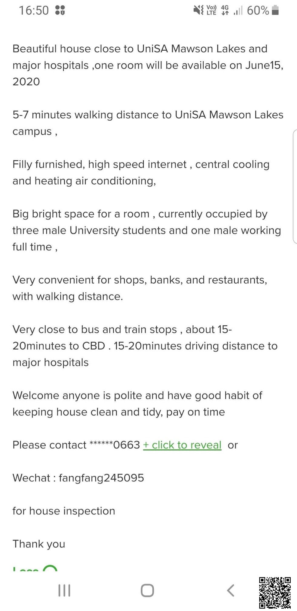 Mawson lake 单间招租,房东人超级好,不同住。希望找到干净整洁的你,室友都是男生,也希望招租男生。四周购物上学都很方便,距离unisa Mawson lake 校区步行5~7min。伶包入住,家具齐全,网速快。距离周边公交站 ...