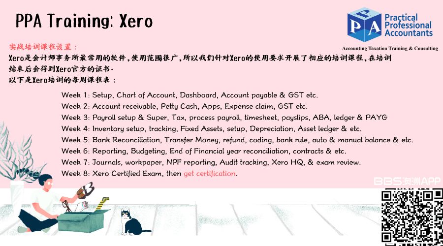 PPA作为一家专业的会计师事务所常年开设会计软件Xero,Payroll,Taxation等课程,这些课程是由经验丰富的会计师整理汇总,手把手教你在事务所工作所需要的技能,为你的职业生涯铺路。 课程完结后会发Certification, ...