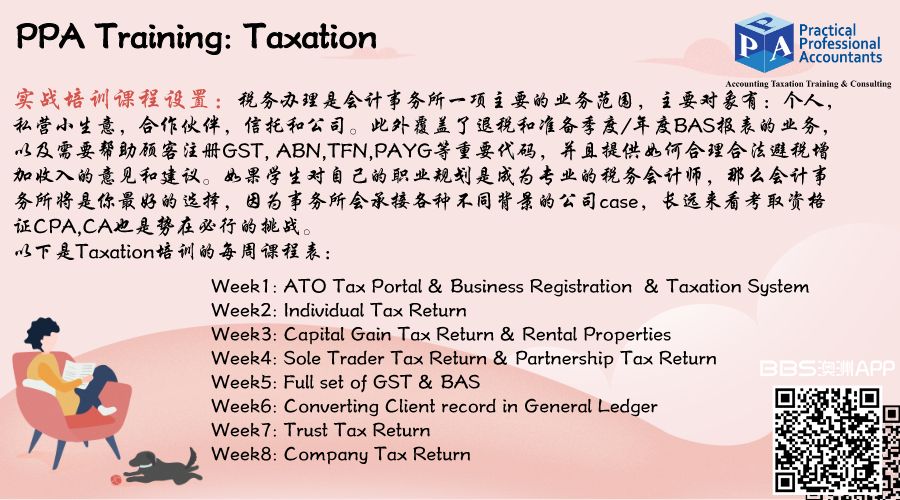 PPA作为一家专业的会计师事务所常年开设会计软件Xero,Payroll,Taxation等课程,这些课程是由经验丰富的会计师整理汇总,手把手教你在事务所工作所需要的技能,为你的职业生涯铺路。 课程完结后会发Certification, ...
