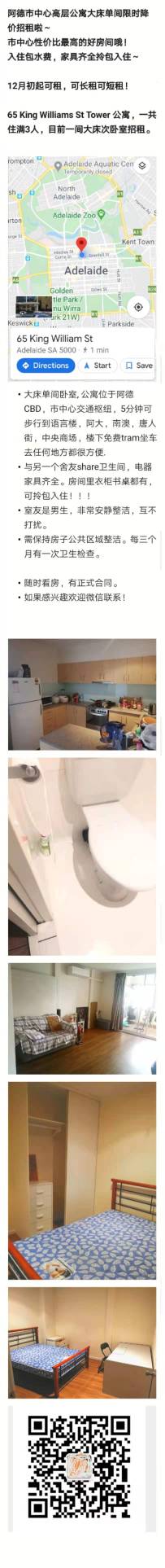 65 king Williams st阿德市中心高层公寓,大床单间限时超低白菜价包水费招租啦~! 可长租可短租,价格可议~ 市中心的位置,郊区的价格哦 且家具齐齐全拎包入住! 即日起租~150/w 包水包网!年底租期到了想搬家到 ...