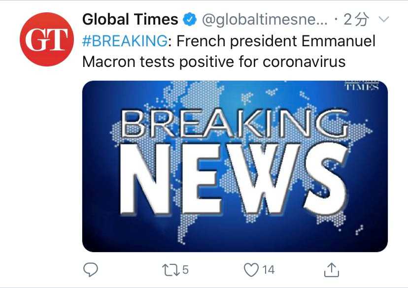快讯! 法国总统马克龙新冠检测呈阳性! 来源: Global Times