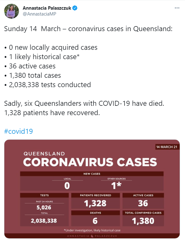 在过去的24小时里,昆州新增1例(疑似历史病例) 昆州州长Palaszczuk说,3月14日昆州新增1个疑似历史感染病例。 她说:“我们想要排除的是……在酒店里有任何传播。” “因为这是解释昨天[周六]发现的病例 ...