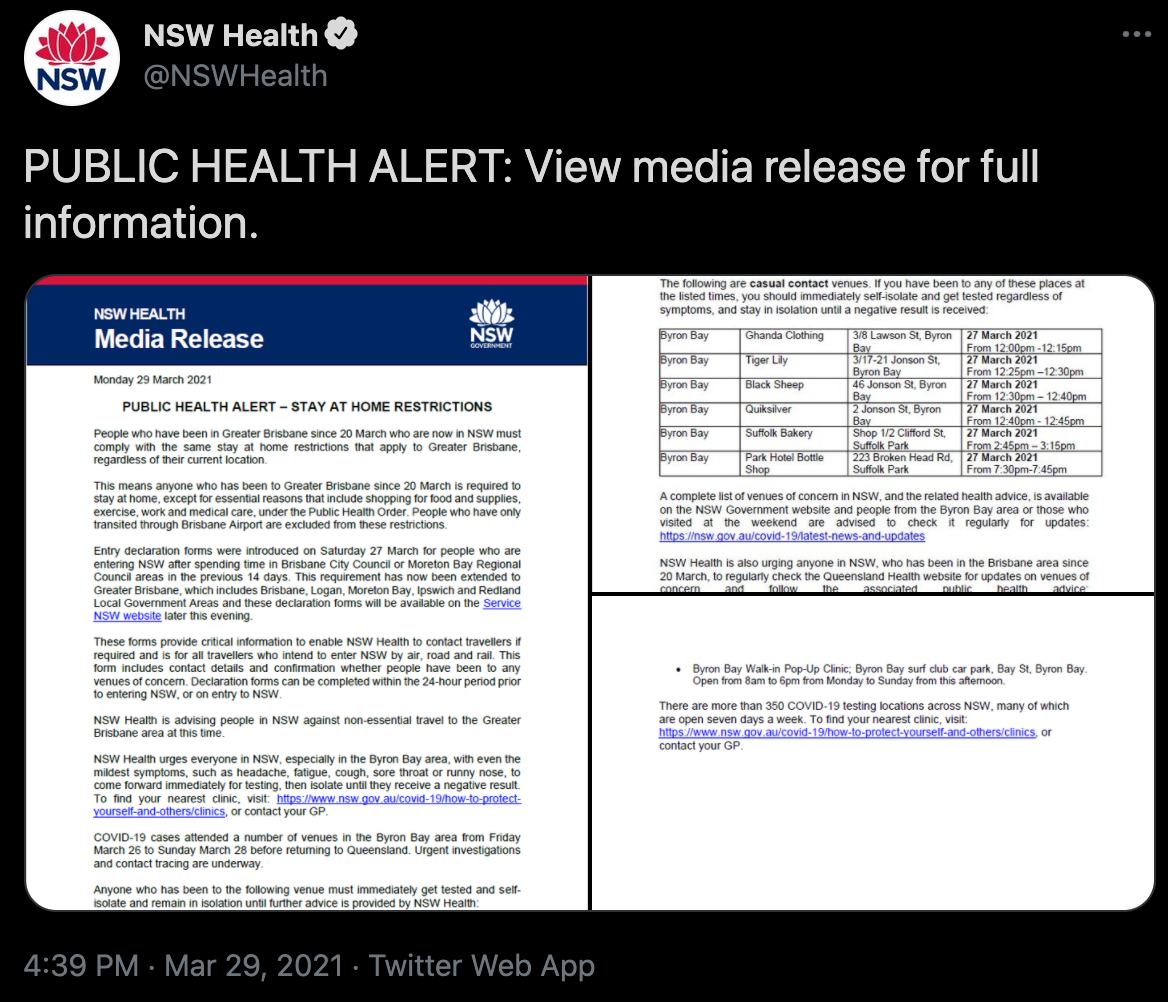 新州卫生部刚刚更新了昆州病例到访场所清单,请速速自查。 图文来源:Twitter 原文链接