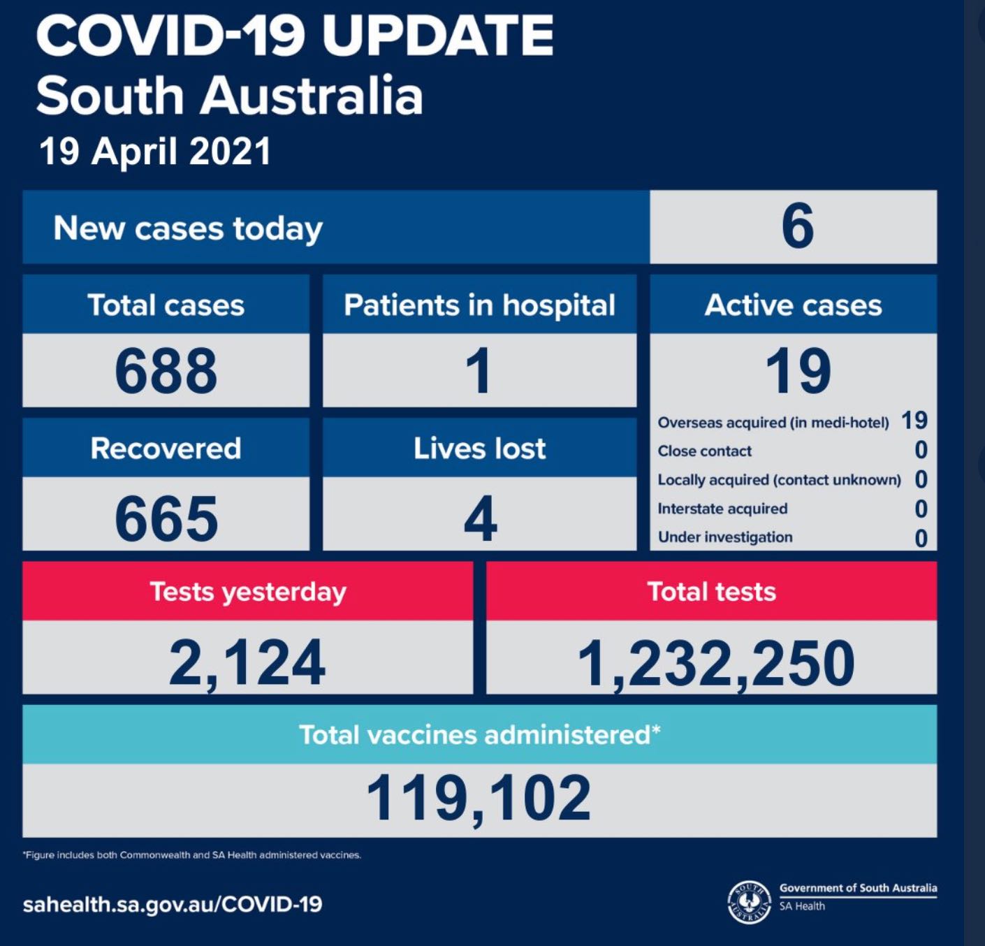 2021年4月19日消息,过去24小时内,南澳新增6例新冠确诊病例,均为海外输入病例。 累计确诊达688例,目前仍有1例在院治疗,康复665例,死亡4例, 昨日南澳全州共提供测试2124次,累计测试达1232250次,总计疫苗注 ...