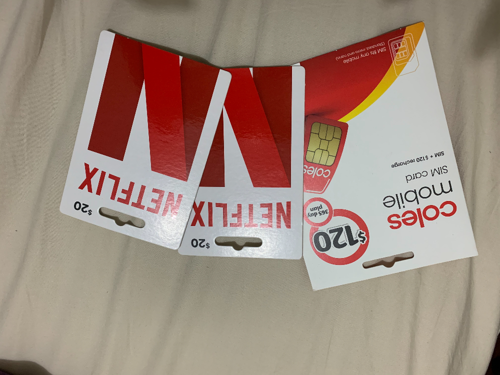 出一張Coles prepaid card 365天 60G 原價120刀 出90刀 (平時特價也要99刀 與Optus線路相同 不怕斷訊) Netflix 20刀gift card *2 兩張帶走30刀出 價格可小刀 意者短信0432324082