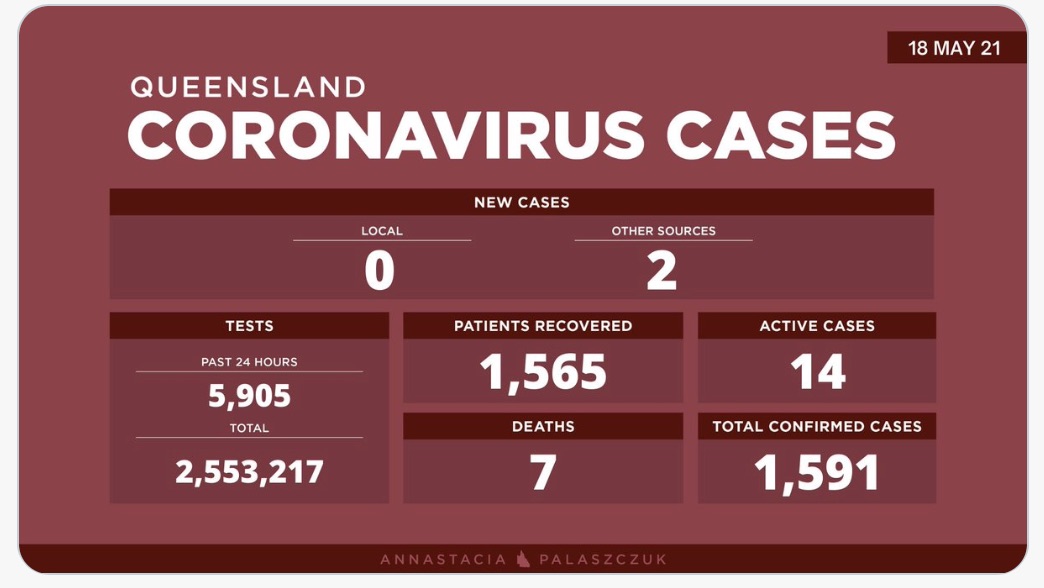 5月18日星期二- 昆士兰的冠状病毒病例更新: - 0例新的本地感染病例 - 2例海外感染病例 - 14例活动病例 -累计确诊 1,591例 - 进行了2,553,217次测试 不幸的是,7名COVID-19患者已经死亡。1,565名 ...