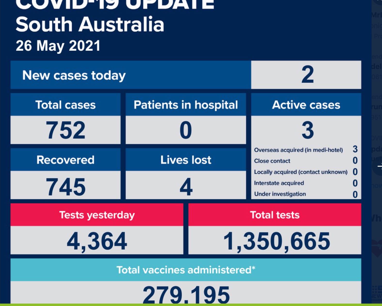 据SA Health 5月26日报道,南澳州过去24小时内新增确诊病例2例。 全州累计确诊病例752例,其中康复745例,死亡4例。 该州仍有活动病例3例。 昨日南澳共检测4364次,累计检测1350665次,累计疫苗接种279195次。 ...