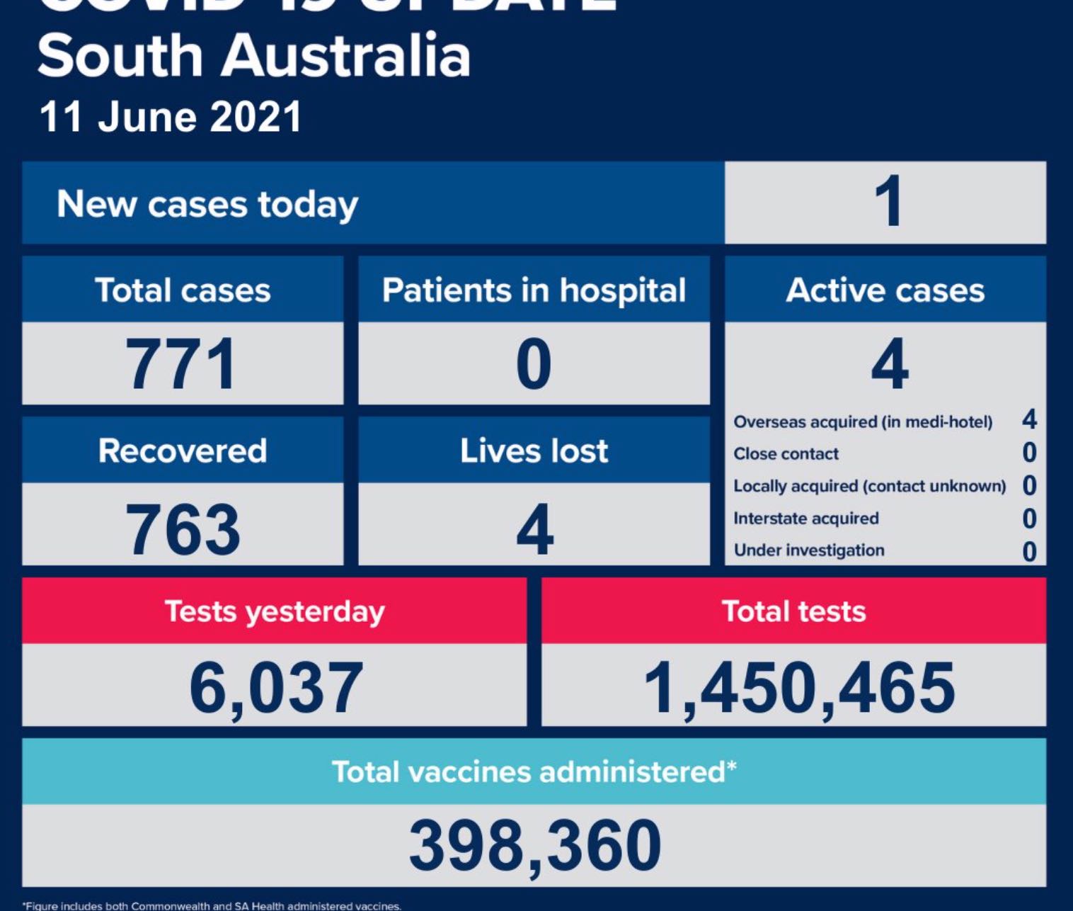 2021年6月11日,星期五,南澳新冠病例情况更新如下: 新增确诊病例1例!无本土感染新增! 活跃病例4例,无患者在医院中康复与治疗。 康复763例,死亡4例。 昨日共进行检测6037次,累计检测1450465次。 ...