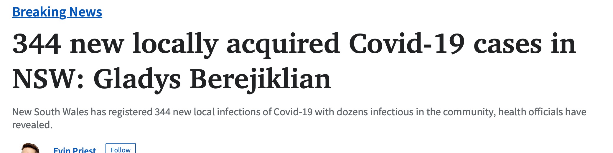 新南威尔士州州长Gladys Berejiklian透露,新南威尔士州过去24小时记录了344例新增本地感染的Covid-19病例。 她说,这名30多岁的男子有其他 "重要的 "潜在健康状况,这名90多岁的男子没有接种疫苗 ...