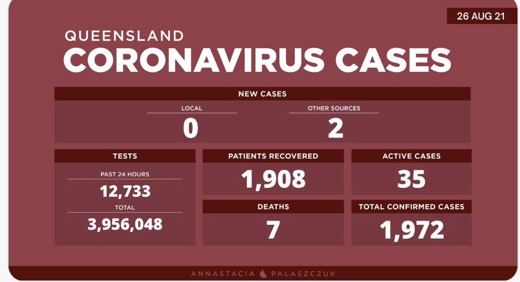 8月26日星期四- 昆士兰的冠状病毒病例更新: - 0例新的本地感染病例 - 2例海外感染病例 - 35例活动病例 -累计确诊 1,972例 - 累计进行了3,95,6048次核酸测试 图文来源:twitter 原文 ...