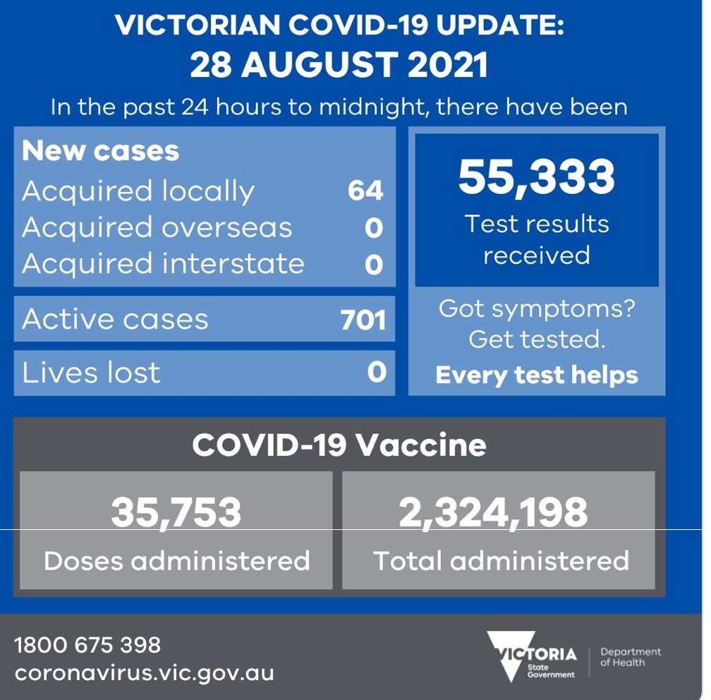 维多利亚州过去24小时记录了64例新增本土COVID-19感染病例,该疫情继续向区域地区蔓延。 埃丘卡(Echuca)的一名老年护理人员被确认为阳性病例,使该地区的社区在本周处于高度警戒状态,Wharparilla Lodge设 ...