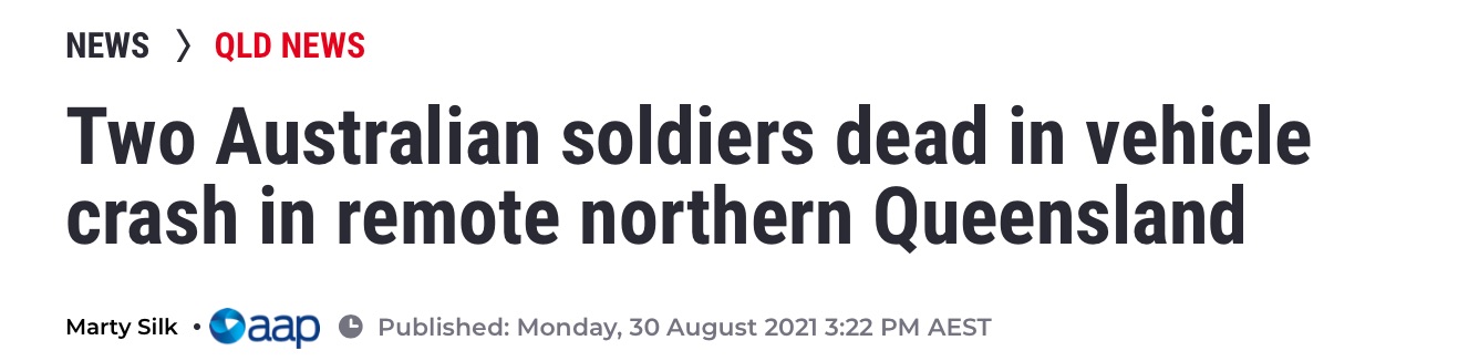 两名士兵在昆士兰北部的一个偏远地区被困在撞毁的军事车辆中,当场死亡。 "这是一项非常危险的任务,我们的部队参与其中,甚至在训练演习期间,以及在我们的国家公路上来回移动设备,"Peter Dutton说。 ...