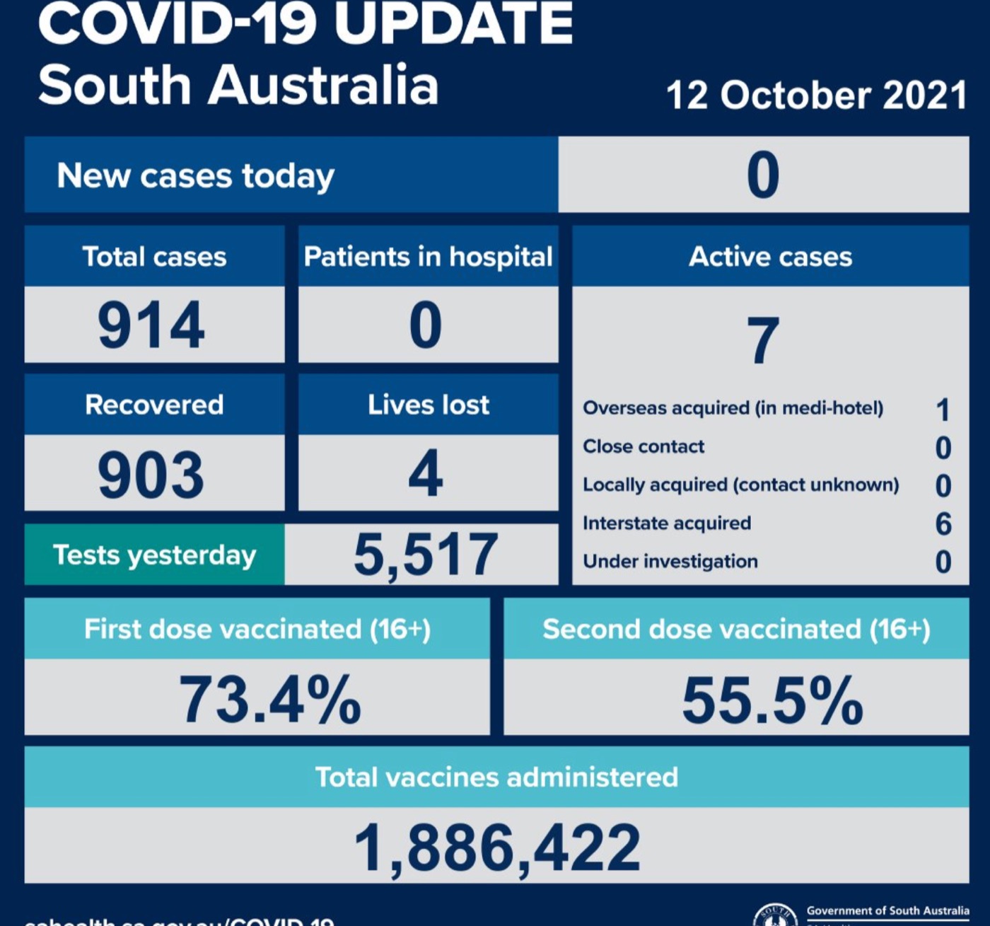 2021年10月12日,星期二,南澳新冠病例情况更新如下: 无新增确诊病例; 活跃病例7例,无患者在医院中康复与治疗。 共康复903例,死亡4例。 昨日共进行检测5517次。 第一针疫苗接种率为73.4%,第二针疫苗 ...