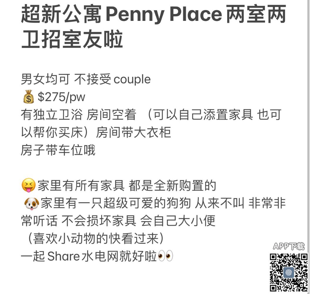 City全新公寓Penny Place两室两卫招室友 微信:lll13935127099 电话:0416947273