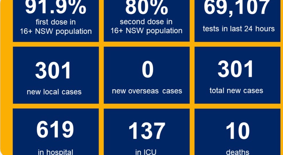 新州在学生返校、社区运动回归和办公室不再需要口罩的前一天,录得301例新增COVID-19本土确诊病例。 完全接种疫苗的新南威尔士州居民从周一开始也将拥有更多的自由,包括可以参加社区体育活动和在家中接待多达20 ...