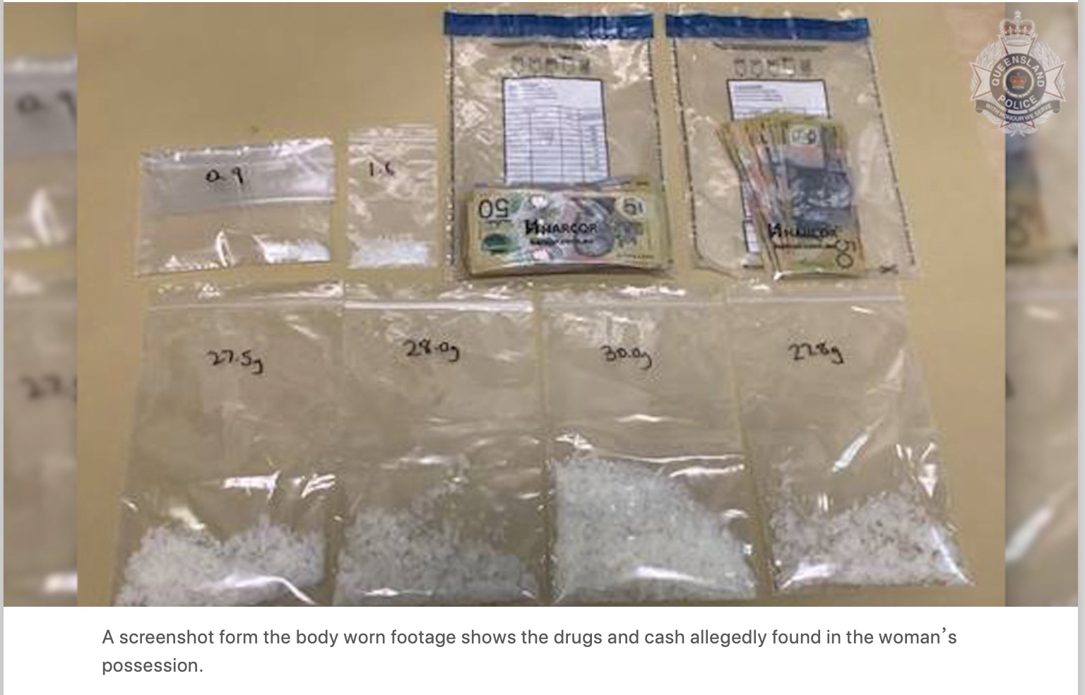 据称,警方在一名黄金海岸女子的Ormeau房产中发现了价值高达12万澳元的甲基苯丙胺(冰毒的主要成分)和现金,该女子将在法庭上出庭。 图文来源:couriermail 原文链接