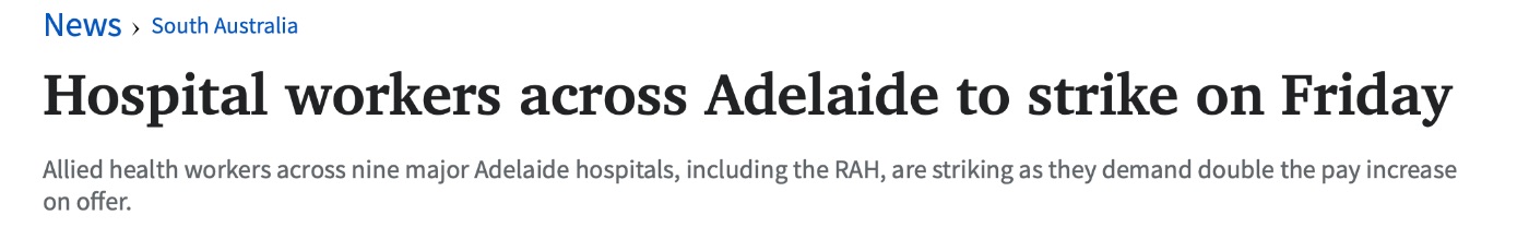 阿德莱德九家主要医院的联合医务人员将于周五进行罢工,要求改善工作环境和增加工资。 信中说:"我们呼吁马歇尔政府尊重我们所做的工作,并针对我们的合理要求紧急进行谈判,以获得公平的结果。&quo ...