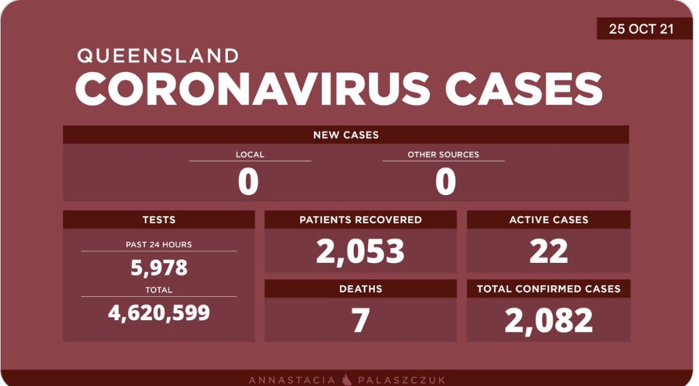 10月25日星期一- 昆士兰的冠状病毒病例更新: - 0例新的本地感染病例 - 0例海外感染病例 - 22例活动病例 -累计确诊 2,082例 -死亡7例,累计康复2053例 -昨日共进行了5978次核酸检测 - 累计进行 ...