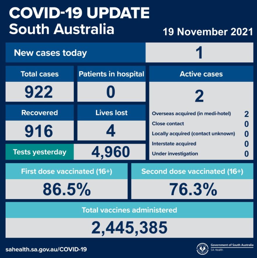 2021年11月19日,星期五,南澳新冠病例情况更新如下: 1例新增确诊病例; 活跃病例2例,无患者在医院中康复与治疗。 共康复916例,死亡4例。 昨日共进行检测4960次。 第一针疫苗接种率为86.5%,第二针疫 ...