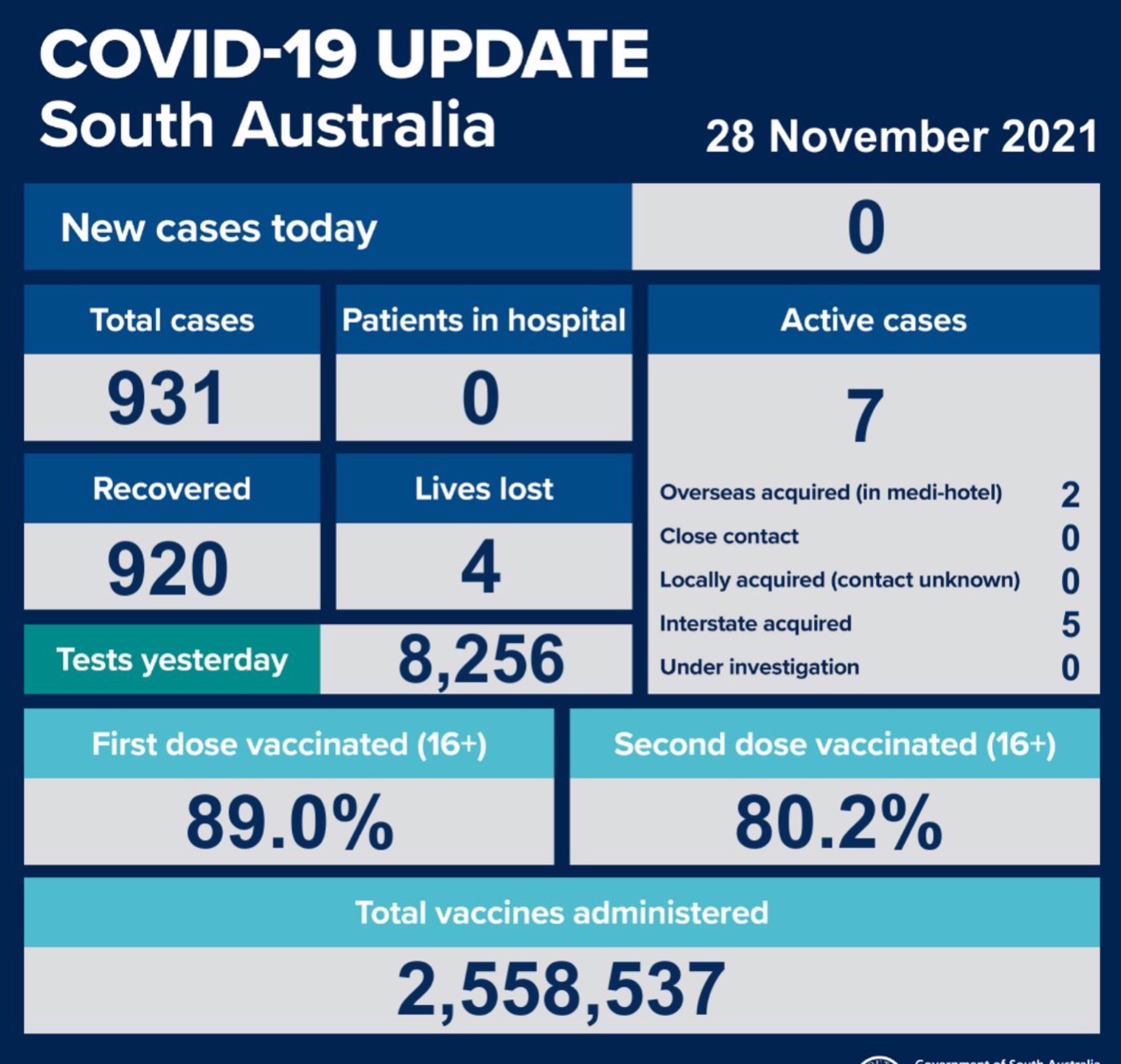 2021年11月28日,星期日,南澳新冠病例情况更新如下: 无新增确诊病例; 活跃病例7例,无患者在医院中康复与治疗。 共康复920例,死亡4例。 昨日共进行检测8256次。 第一针疫苗接种率为89.0%,第二 ...