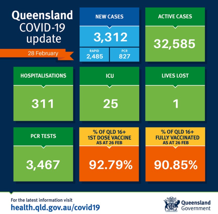 昆州记录了3312个新增确诊病例,1人死亡,目前昆州有32,585个活跃病例。 有311名COVID-19患者住院,其中25人在ICU。 昨天,昆州有3467人接受了PCR测试。 目前,92.79%的16岁以上的昆州人已经接种了第一 ...