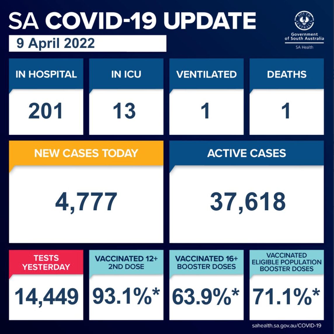 在过去的24小时里,南澳新增4777例确诊病例,1人死亡! 目前有37,618个活跃病例。 南澳卫生部证实,有1人死亡,一名90多岁的妇女。 目前有201名COVID-19患者住院,其中13人在重症监护室,1人需要呼吸机治 ...
