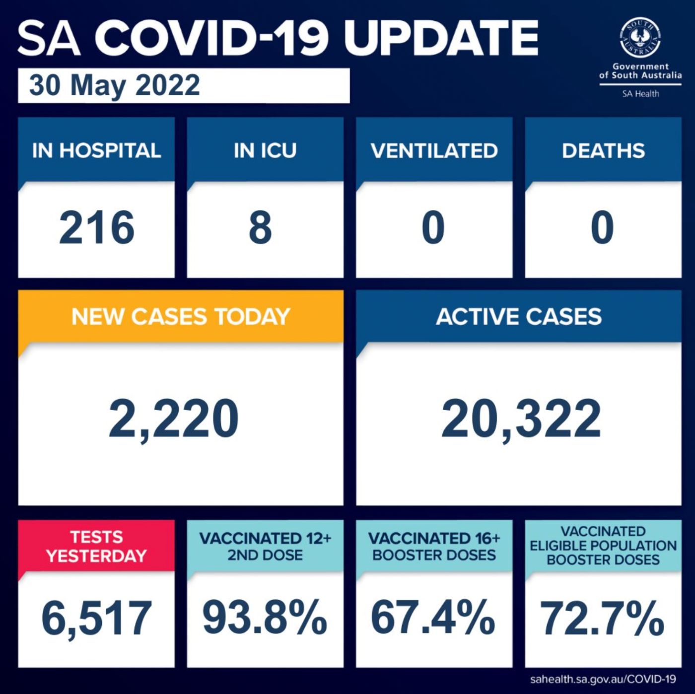 在过去的24小时里,南澳新增2220例,无人死亡! 目前南澳有20,322个活跃病例。 目前南澳有216名COVID-19患者住院,其中8人在重症监护室。 在住院患者中,有103人已接种三针或四针疫苗,88人未接种或接种了 ...