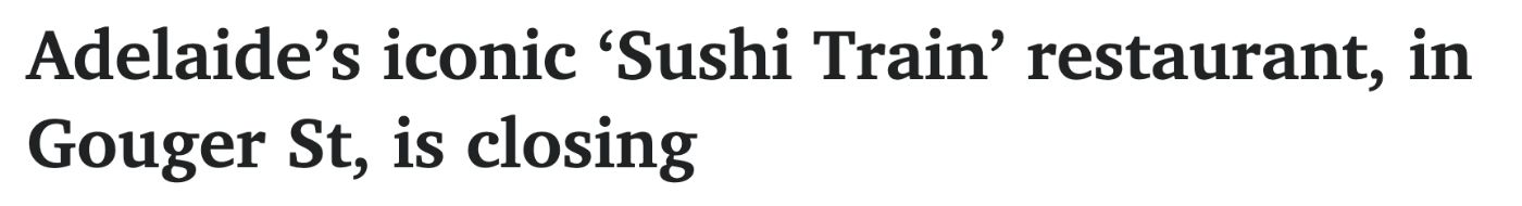 阿德莱德标志性的Sushi Train餐厅位于唐人街Gouger St,已经经营了18年,但却即将关闭。 Tokuro先生和一些员工将搬迁到Plympton的Sushi Train餐厅,它是留在南澳的七家餐厅之一。 他希望未来能在新的开发 ...