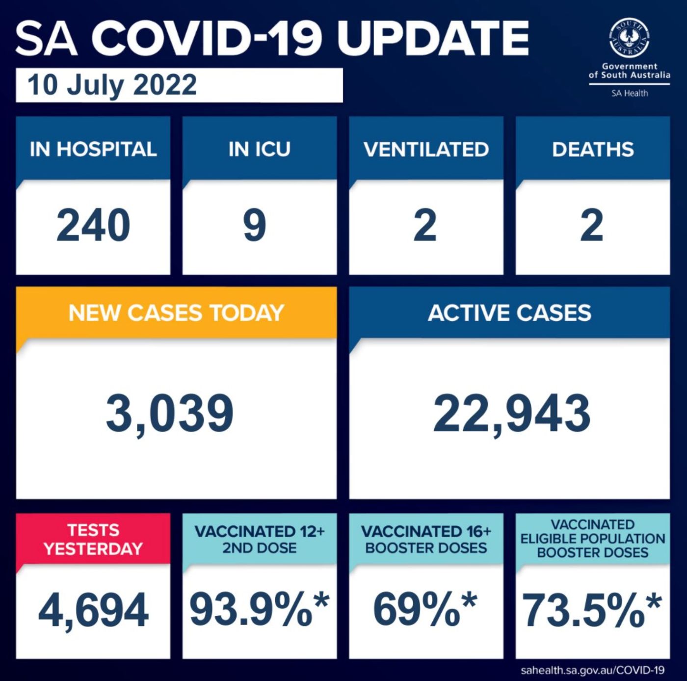 在过去的24小时里,南澳新增3039例,2人死亡! 目前南澳有22,943个活跃病例。 南澳卫生部证实,有2人死亡,是一名50多岁的妇女和一名90多岁的妇女。 目前南澳有240名COVID-19患者住院,其中9人在重症监护室 ...