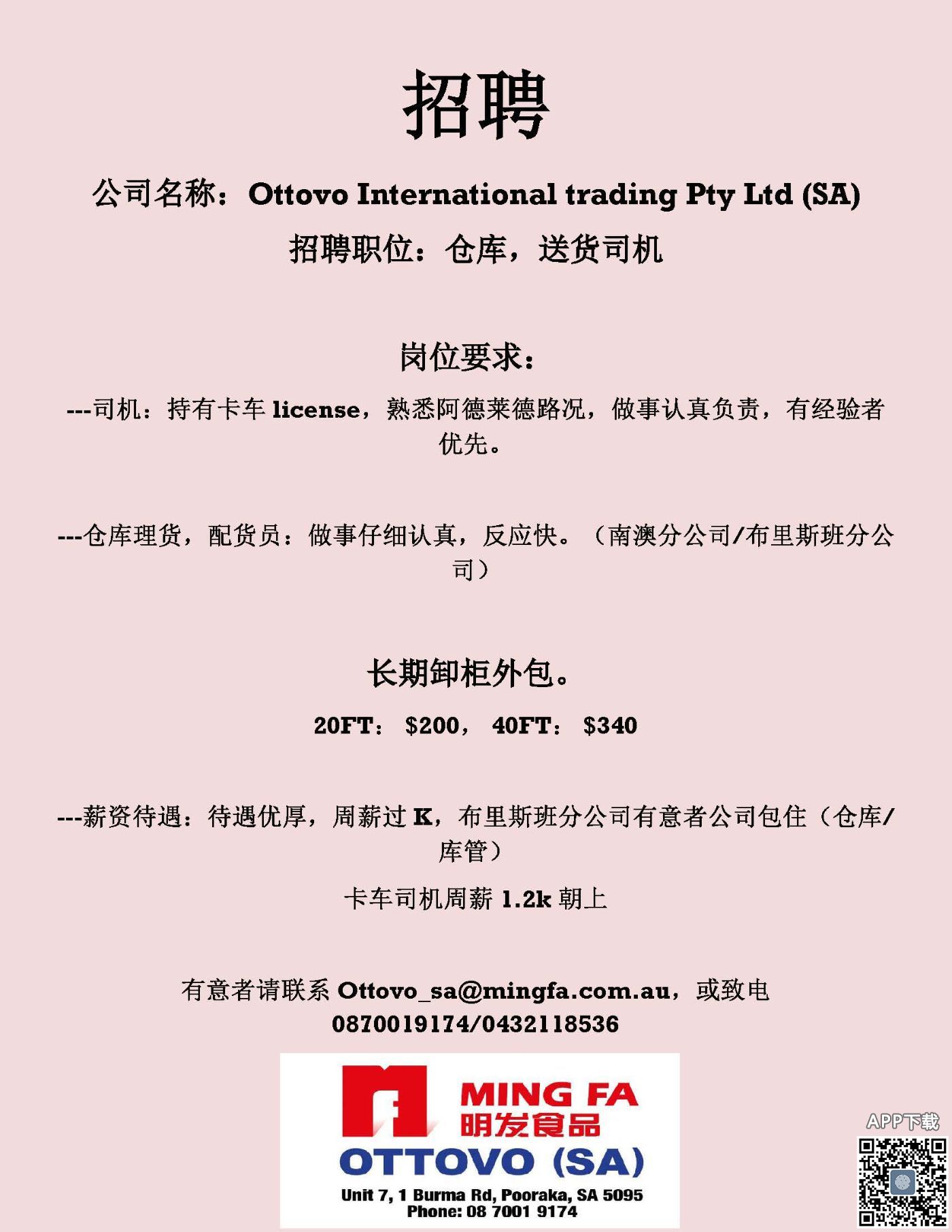 招聘公司名称:Ottovo International trading Pty Ltd (SA)招聘职位:仓库,送货司机 岗位要求:---司机:持有卡车license,熟悉阿德莱德路况,做事认真负责,有经验者优先。 ---仓库理货,配货员:做事仔细认真,反 ...