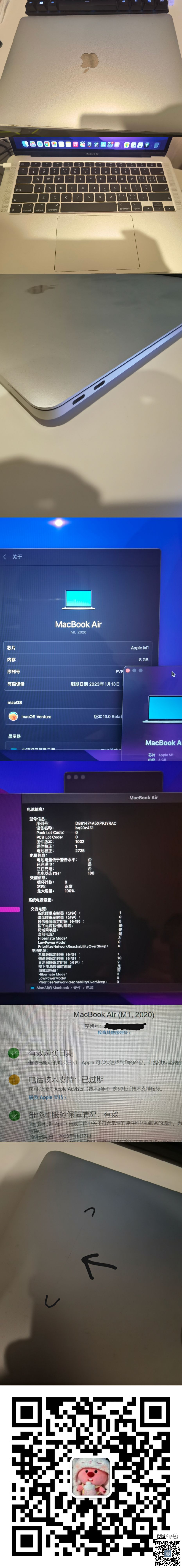 MacBook Air m1芯片国行版,8-cpu 7-gpu,8+256,外壳有一道划痕图片有标注,除此之外没有痕迹,今年一月份才激活,无箱说无插头带c to c的数据线,爽快送一个官网的电脑包,价格跟国内二手平台一样,1100可以小刀 ...