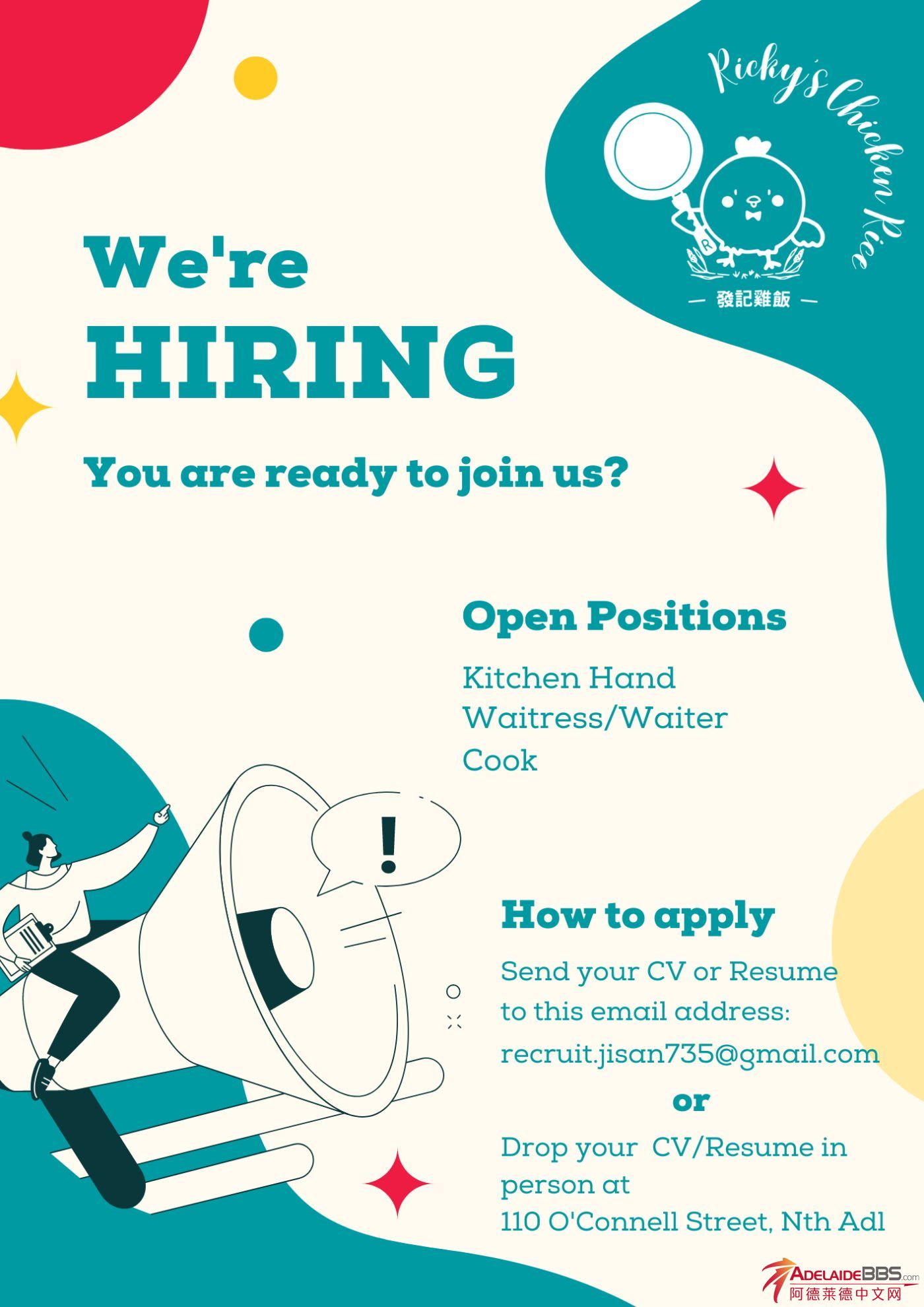 位於North Adelaide餐館招募新成員,合法工資+SUPER,時數穩定。 服務員兩名:一週上班3 -4天或以上 Cook:一週上班3-4天 有經驗者佳,無經驗者可培訓。 歡迎有責任心,上進的小夥伴 ...