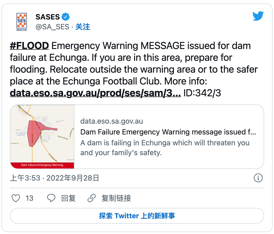 南澳紧急服务部门(SES)已向Adelaide Hills的Echunga发布大坝决堤紧急警告。 他说:“大坝倒塌并不是不可避免的。” “这可能是由最近的降雨造成的,目前我们正在确定有多少人将受到影响。” SES正在通 ...