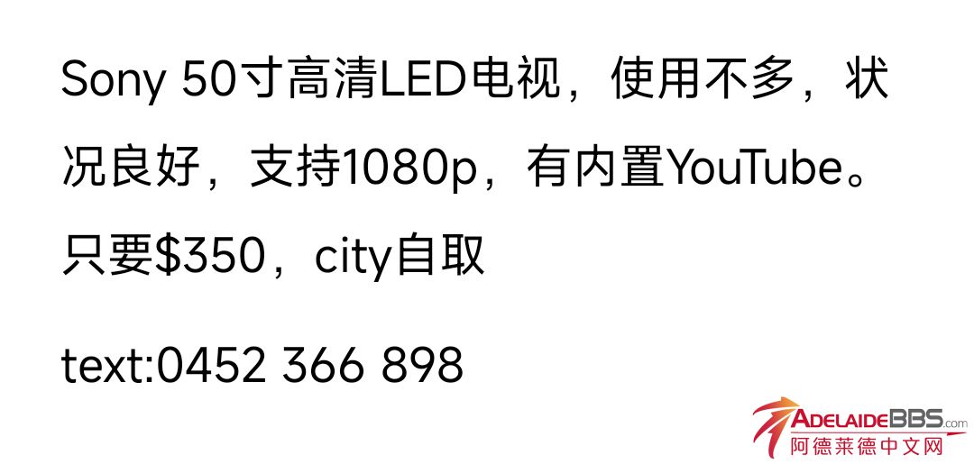 Sony 50寸高清LED电视,使用不多,状况良好,支持1080p,有内置YouTube。只要$350,city自取 text:0452 366 898