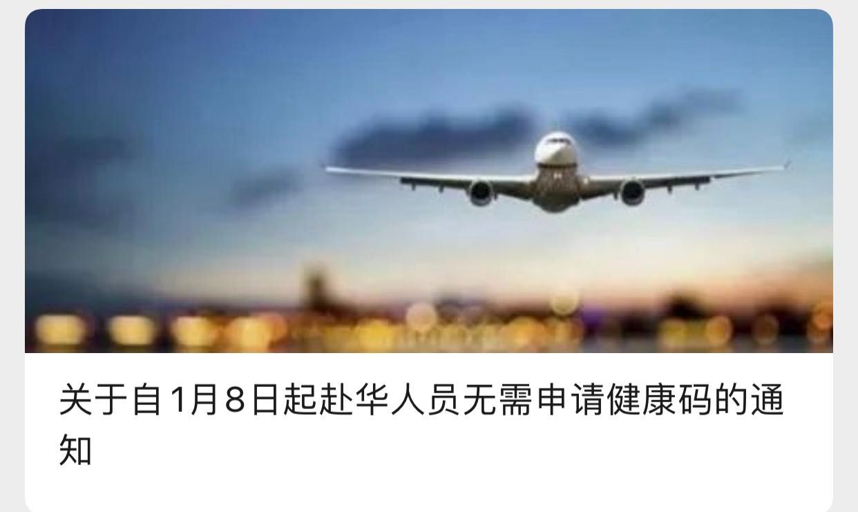 中国驻悉尼总领馆12月28日发布了《关于自1月8日起赴华人员无需申请健康码的通知》,具体内容如下: 文章来源:中国驻悉尼总领馆 原文链接