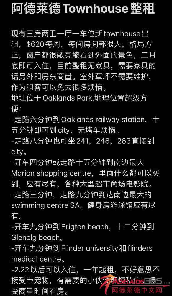 阿德莱德Townhouse整租 现有三房两卫一厅一车位新townhouse出租,$620每周,每间房间都很大,格局方正,窗户都很敞亮能看到外面的景色,二月底即可入住,目前整租无家具,需要家具的话另外和房东商量。室外草坪不需 ...