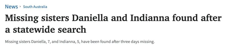 警方证实,在经过三天的搜寻后失踪的姐妹Indianna(5岁)和Daniella(7岁)被找到。 Daniella有一头及腰的长发,最后一次被看到时,她穿着一件米妮老鼠长袖连衣裙。 Indianna有一头金色的长发,最后一 ...