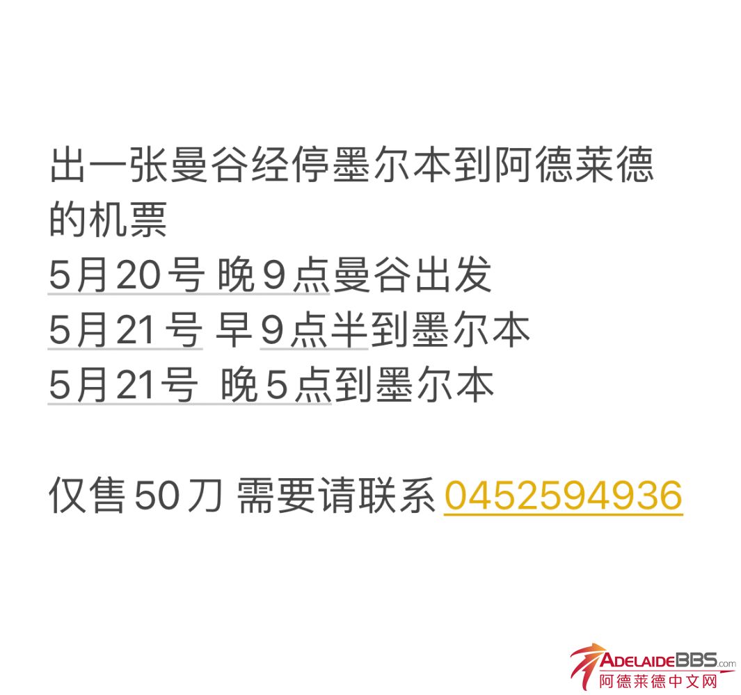 转一张5月20号曼谷回阿德经停墨尔本的单程机票 50刀