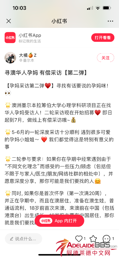 帮忙转发:澳洲墨尔本拉筹伯大学心理学科研项目正在找华人孕妈受访人!时间是今年6-7月份,做线上有偿采访哦~也可添加VX:BigMandarin_ZJan
