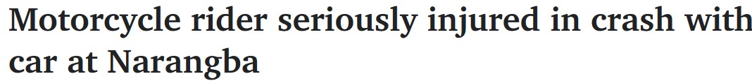 ​周六下午,两辆摩托车在布里斯班北部的Narangba行驶时发生碰撞事故,其中一辆摩托车撞向一辆汽车,一名骑手伤势严重。 旅行车的司机,也是唯一的乘员,一名57岁妇女,身体没有受伤,但在现场接受了 ...