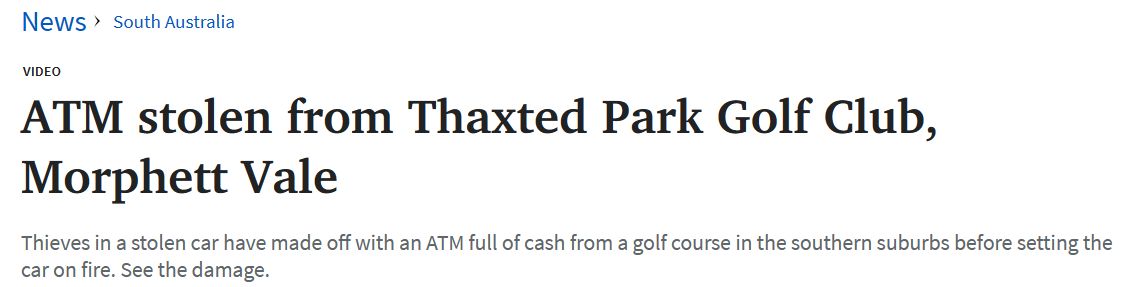 今日上午,一窃贼驾驶一辆偷来的汽车,从南澳南部郊区的一个高尔夫球场盗走了一台装满现金的ATM机,然后点燃了汽车。 巡逻人员到达现场后发现俱乐部的大门被一辆汽车撞坏。 据说这辆车是用来移走俱乐部内 ...